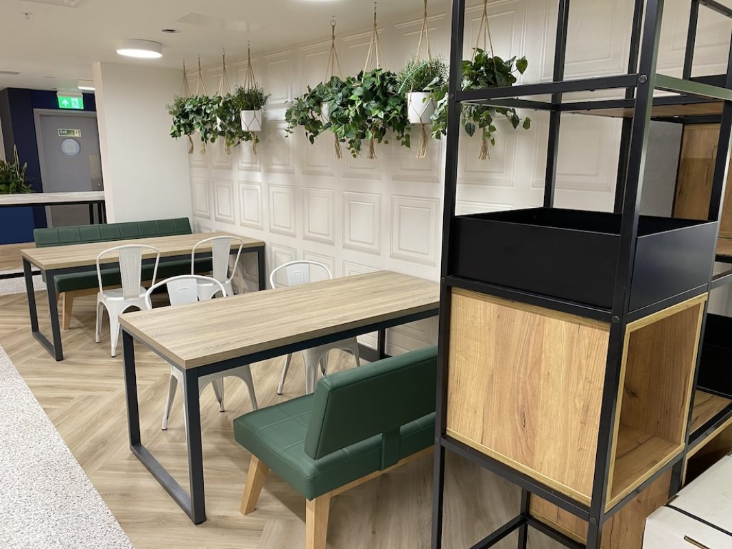 We added a Timber half height divider wall addressing both functionality and aesthetics, reducing noise from servery into the main canteen and maintaining a visual connection throughout the space. Contrasting LVT flooring and linear lighting highlight the circulation space surrounding the canteen, whilst feature lighting in the seating areas enhances the overall atmosphere.