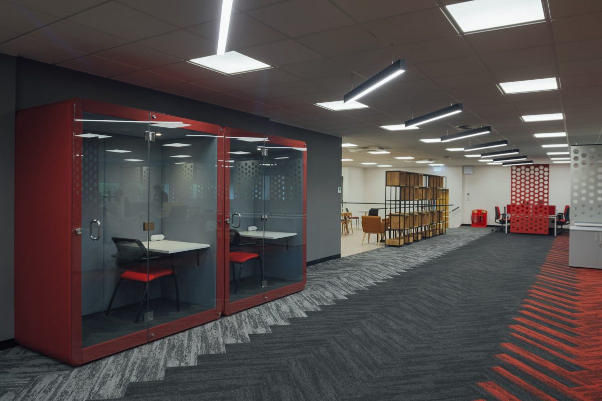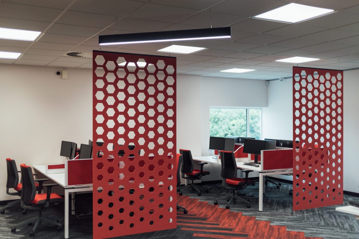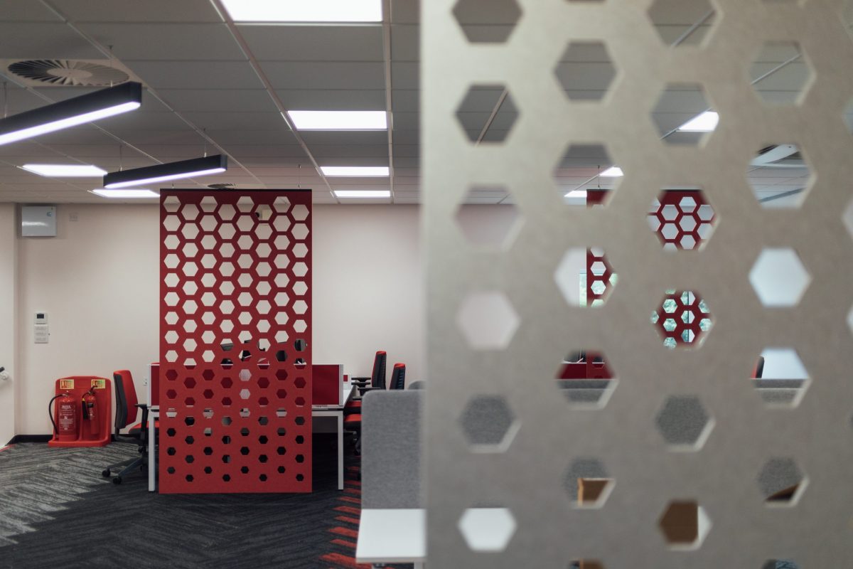 It was important to bring through brand colours throughout the design to strengthen identity and sense of belonging within the office space. We used hexagons and the bold red colour within the main office and softer tones in the breakout space. Also by adding storage units and lockers to hide personal belongings created a clean professional look to the office prompting the values of the company.