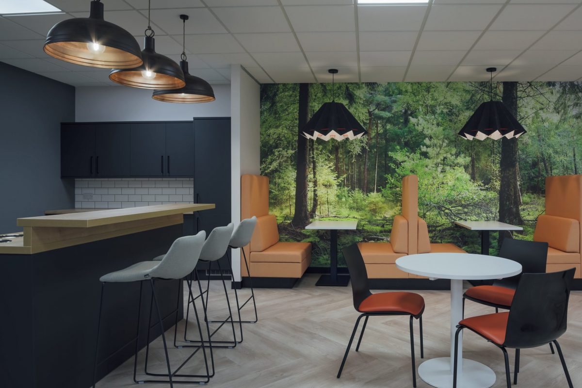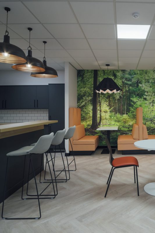 The design opened up the existing kitchen to create a dedicated breakout space providing employees with a space to relax, meet and socialise. By using muted colours and a large nature inspired feature wall we created a new environment with a different feel to the office, providing a variety of seating options from booths to bar seating to suit all needs and activities. Acoustic lampshades were also used to reduce noise transfer to the adjacent office area.