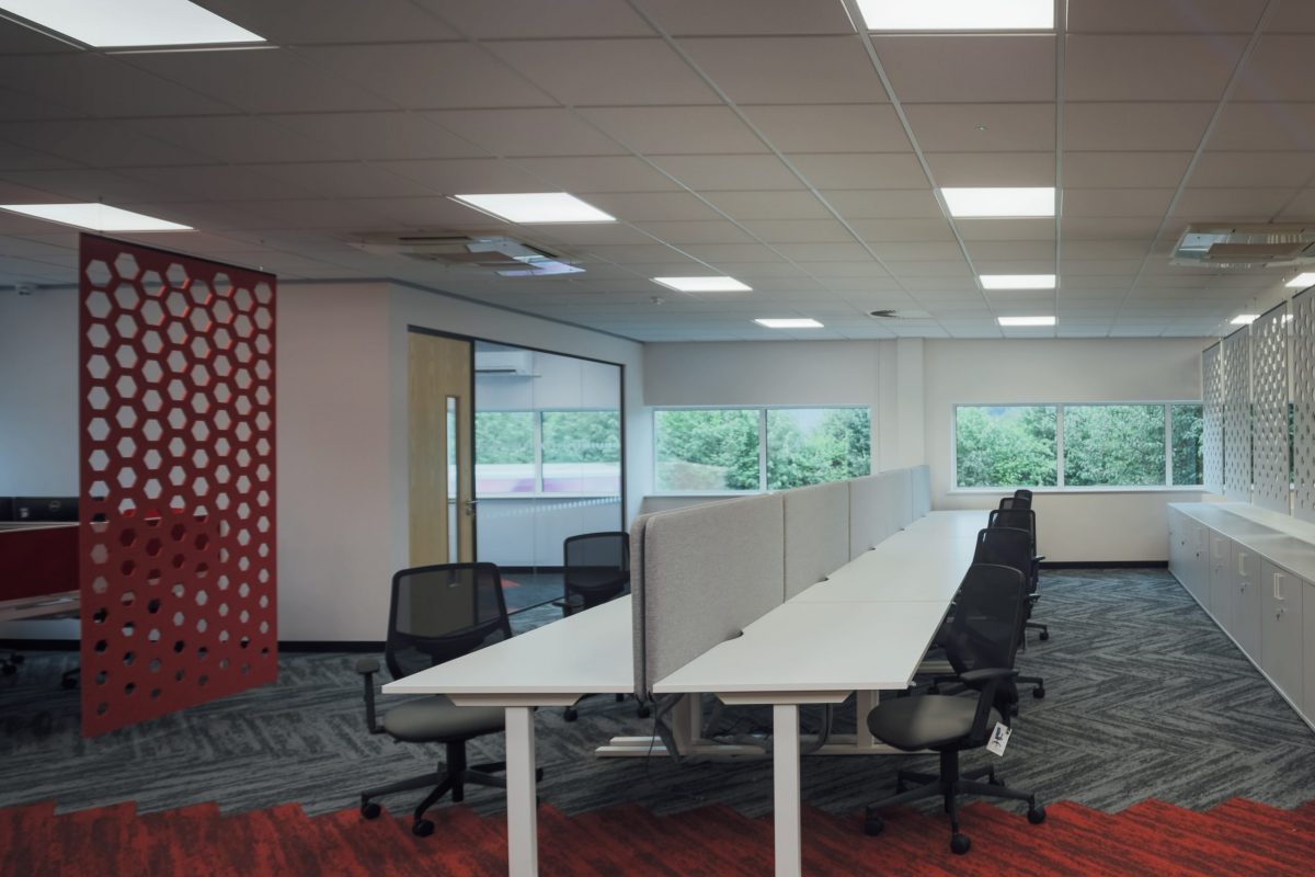 We designed a new office with hanging acoustic baffles and low level storage between desks to help with noise attenuation. The acoustic dividers add interest and colour to the space as well offering privacy to each team. We designed in a dedicated hot desking area where employees can drop in and work as needed and created 3 new offices to double as meeting rooms for the individual teams, with glazed window modules allowing a visual connection to the main office. Creating a central walkway using carpet tiles and angled linear lighting helped zone areas and maintain flow through the office.